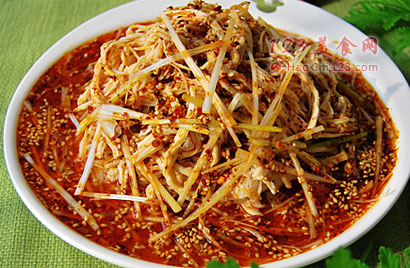 4、用盐、生抽、糖、香油、香醋、味精、辣椒油、芝麻酱、熟芝麻、一勺煮鸡的冷汤调成汁儿,淋在鸡丝上。