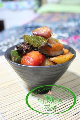 1.做法:热锅倒油,加入大料和大蒜爆香后,加入土豆和茄子煸炒至七成熟后加入黄瓜、西红柿和青椒,调入韩式辣椒酱炒加放少许开水均后,炖十分钟左右,待土豆软烂后调入少许白糖和盐出锅即可。 做这道菜时我喜欢放很多蒜,并将大蒜带皮放入锅里一起炖,带皮可以使大蒜不容易烂到锅里,而且非常香,口感糯糯的,特别好吃,我也特别爱吃! 这道菜的汤汁如果在开始放得多时,不必担心,最后出锅前也没有必要收得太干,剩下的汤汁可以用来拌面,那味道,真是没的说。