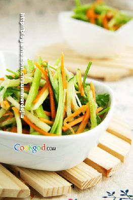 3、香菜切段,胡萝卜、黄瓜切丝;