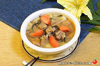 3、把水加在锅里,最好放些动物油,再把一大堆菜和排骨丢进去,再加上些八角之类的,用大火,煮啊煮啊煮,一直煮到这些东东熟了为止。
