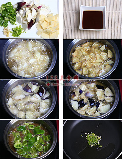 6、茄子炸成金黄色捞出待用。