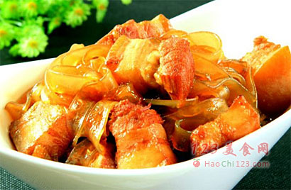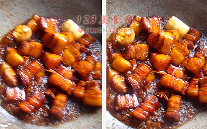 11、火候的数据:加完热水后,大火炖制10-15分钟,转最小火炖制1.5个小时之后,这时转大火收汁,下入粉条,加入盐,每500克肉,2克盐。这时不要离开人,大约20分钟一旦水面低于肉面1厘米,片刻即可关火。