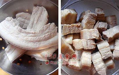 2、五花肉焯水数据:五花肉洗净后,一定要凉水入锅,这样炖出的瘦肉不塞牙,水开后计时5分钟即可捞出,用凉水冲净浮沫,控干后切成方块备用,焯水后的方块,才方正。