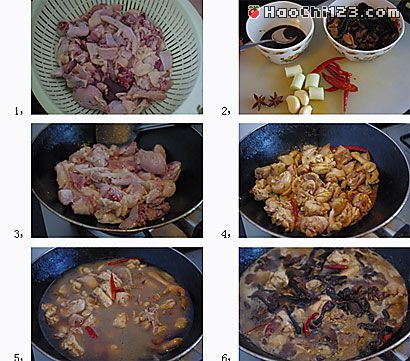 童子鸡1只、干榛蘑70G、老抽2汤匙、料酒1汤匙、生抽1汤匙、盐1/2茶匙、白糖2茶匙、葱段4段、干红辣椒7个、蒜3瓣、八角2个。