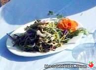 2、 鸡丝加入蛋清用沸水焯一下,变色后捞出;