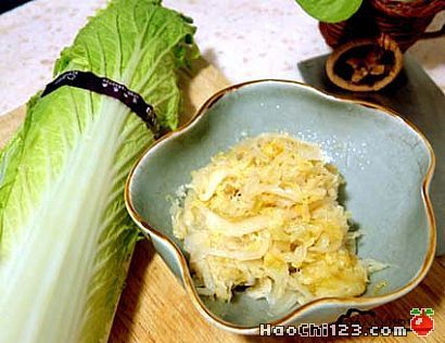 2、把白菜去老帮码放在容器内,尽量把所有空间挤满,如果不好放可以把部分白菜切开。