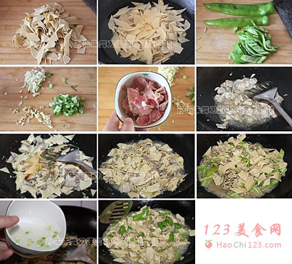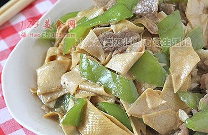 1、干豆腐也可以切成条状,不过尖椒也要随着切成丝状,肉也切成丝状,菱形块是东北尖椒干豆腐最常见的切法。