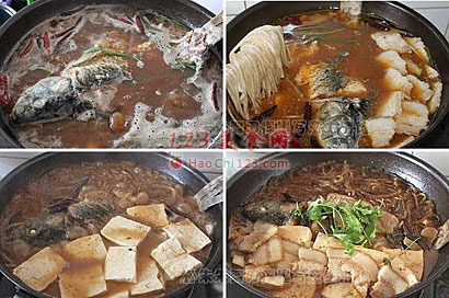 15、放入粉条和五花肉片后再炖10分钟,然后在五花肉那边放上豆腐(如果有白菜叶就用手撕成块放在粉条那边)再炖5-10分钟后,改大火将鱼汤收浓放上香菜就可以出锅了,酱是咸的,一般不再放盐,也可以尝一下鱼汤,根据自己的喜好再放点盐,一定要留一点鱼汤泡饭吃非常好吃。