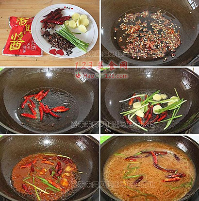 11、将干辣椒放入炸变色,放入葱段姜片出香味。