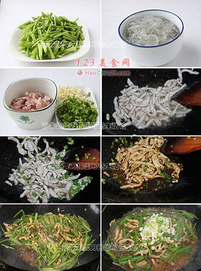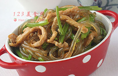 7、放入芹菜炒匀,再倒入粉条炒透。