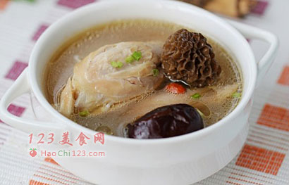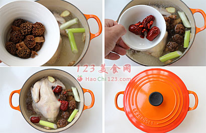 2、锅中倒入少许植物油,烧开炒香姜片后加入适量的水与童子鸡(水量以刚刚没过鸡肉为益)放入葱段,羊肚蘑,大枣枸杞,盖上盖子大火烧开。