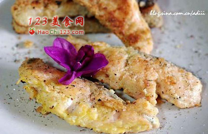 3、也可以把大马哈鱼先蘸蛋液再裹匀生粉,这样煎出来的鱼也很柔软.