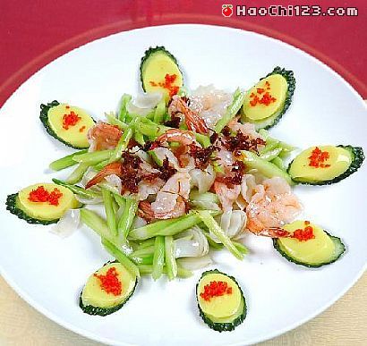 1、虾片锤好,芦笋、百合、黄瓜、豆腐按照片样处理好。