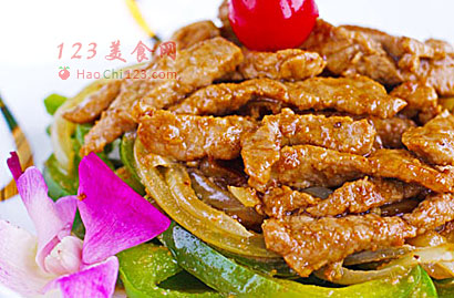 12、将炒好的牛柳放入盘中的青椒丝上即可。也可以再用红樱桃和鲜花略加装饰。