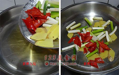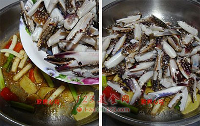 6、第七个细节:小火爆香大葱大姜2分钟。葱姜爆香后,加入一茶匙沙茶酱,炒匀后,再倒入蟹脚。