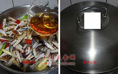 7、第八个细节:第一次沙茶酱调味后,向锅中烹入一小碗料酒,盖盖焖2-3分钟,使蟹脚入味。