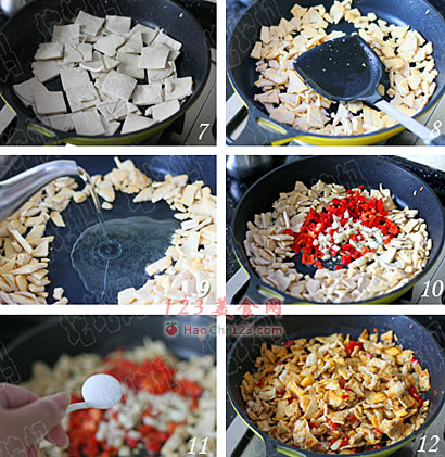7、将咸蛋盛起,锅内只留一点点油,转中火,下入臭干煎熟。
