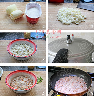 2、将藕切成比较薄的小丁。