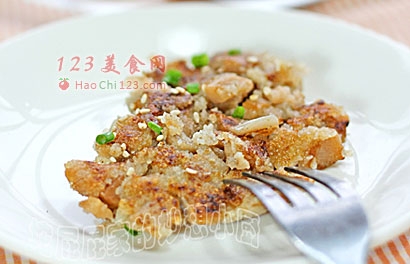 6、平底不粘锅烧热,不放油,锅底撒上一层熟芝麻,倒入蒸好的藕,用锅铲压成较薄的圆饼形,小火煎5分钟即可,注意这里只用煎一面,不用煎两面。最后取一大盘,将煎好的蒸藕快速倒扣在盘中,表面撒上葱花即可。