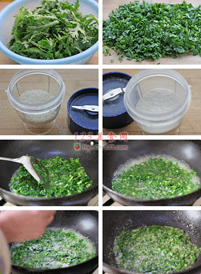 8、均匀的抄动茼蒿,至糯米粉涨发,水分差不多收干,茼蒿成糊状即可。