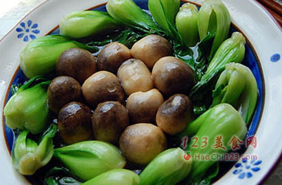 3、将过凉的菜心倒入锅中,翻炒片刻马上盛起入盘中围边,将草菇盛在围好的菜心中间,收浓的汤汁,均匀的淋在草菇和菜心上。