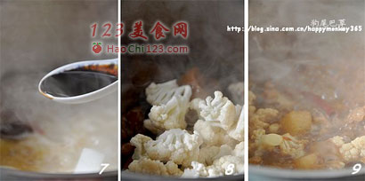 8、9、待萝卜变软后,即可加入花菜,并转大火开始收汁。花菜很易熟,汁儿收得差不多花菜也就熟了,撒上葱花即可出锅。