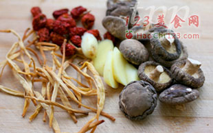 土鸡一只、生姜、黄花、红枣、香菇各适量。