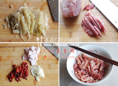 2、肉切细丝,加盐、淀粉、生抽拌匀码味。