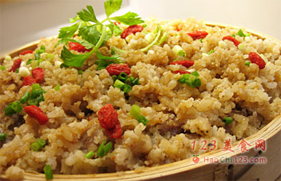 4、南瓜去皮切块,满铺蒸格底层,上面再铺上3中的排骨,蒸锅蒸透即可(我问过钟祥做蒸格的大师傅,他那“一笼六蒸”,灶上蒸了一天)。
