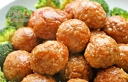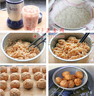 6、炒锅倒入大半锅油,大火烧到七成热时,转小火,下入肉丸炸至表面金黄。捞出滤干油份。