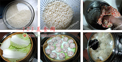 5、将3中调好的肉馅,以1个汤勺量为标准,用勺挖起,两手掌心团起,两手交替摔打,肉馅形成圆形丸子后,裹上1中的糯米,注意用手轻轻地按压一下,让米粒紧一点镶在肉里,摆到4中的大白菜上,如此这般,依次将肉丸制作摆放好。