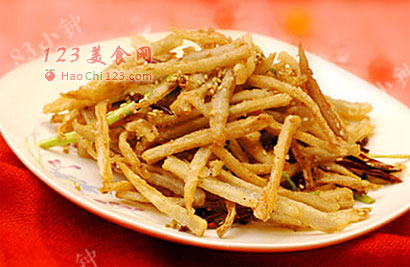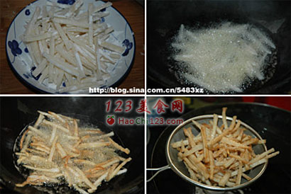 2、油必须多放些,炸的时候用浸炸,用筷子边炸边拔拉下,藕丝才不会容易粘连在一起。另外,拌淀粉那一步,在藕丝准备下锅时再做也能更大程度上避免藕条粘连。