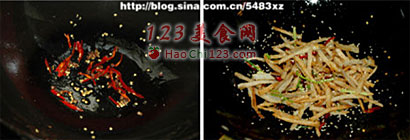 4、步骤5时,翻炒一定要快。最好能先把调料调好,藕丝回锅后,马上放上调味料,翻匀起锅。