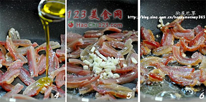 4、5、6、将腊肉片下入锅中,加1勺油,蒜末,煸炒2-3分钟,至腊肉的肥肉部分变透明。
