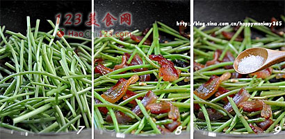 7、8、下入藜蒿,加少许盐翻炒均匀(因为腊肉是熟的,藜蒿也很易熟,所以炒两三分钟即可。腊肉是咸的,盐看着放)。