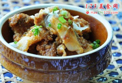 2、将鱼肉用姜末、葱末、生抽、老抽,蚝油、料酒、盐、猪油拌匀(生抽,老抽,蚝油,料酒的比例可为2:1:1:2,老抽主要为调色用,因蚝油和酱油都有咸度,盐可适量少放,猪油可起提香,润滑滋润的作用)。如果用的是超市卖的调好味的蒸肉米粉,可尝下米粉味再根据自己喜好调味,我试用过这种米粉,除了盐,以上调味料还可以添加工。