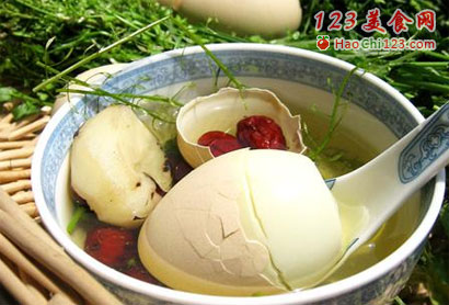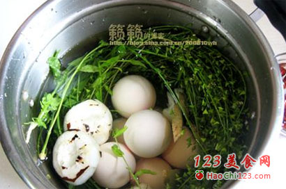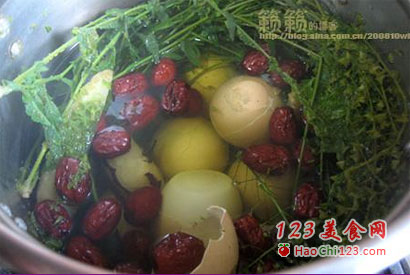 4、鸡蛋煮熟后,用勺把锅里的鸡蛋壳轻轻磕破(以便入味),加入红枣,再煮约15分钟即可,出锅前依各人口味调一点盐或糖,或者什么都不放。盛到碗里,清香扑鼻,地菜花煮出的汤水也是绿的,就连光溜溜的蛋壳上也染上一层淡淡的绿,沁人心脾的香啊!