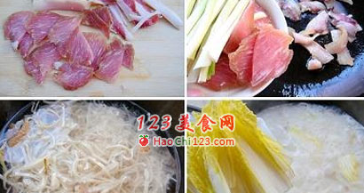 3、加入清水(凉的)和豆丝,转大火煮开。