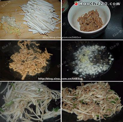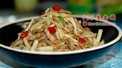 4、倒入肉丝炒匀,撒少许鸡精提味起锅即可。