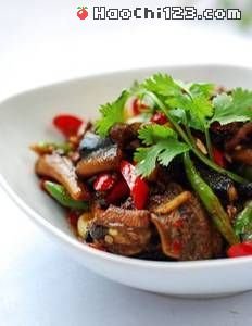 5、炒的过程中,可沿锅边加入少量的水,让菜汁丰富点,鳝片也会更入味,感觉到鳝片已经上色,出香时候,撒入少许黑胡椒粉,加入小香芹,兜匀即可起锅。