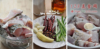 2、鱼块表面阴干后,轻轻除去表面附着的佐料(佐料别扔,放一旁备用)。锅子烧热,加适量油,下入鱼块——煎鱼块时要将鱼本身附着的佐料剥掉,否则煎制时佐料遇热会变黑变焦。