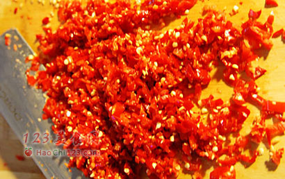 3、将红尖椒去蒂切碎,蒜瓣一起切碎,剁成均匀的碎末。