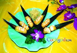 2、锅中加油烧至五成热,将雪梨条逐一挂上脆皮糊入油锅中,小火炸至金黄色出锅装盘,上面淋上沙律酱,伴土豆松食用。