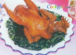 4、锅内放猪油,下入绿叶菜,加入余下的精盐和味精炒匀至熟,滗去汤汁,将菜围在盘内鸡的周围即成。