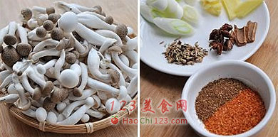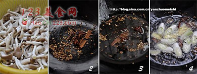 2、3、锅热后,开小火,倒入八角、桂皮、丁香、茴香干焙,焙2分钟后倒入油,小火加热油,炸出香料味(一定要用小火加热,火大,香料易糊)。