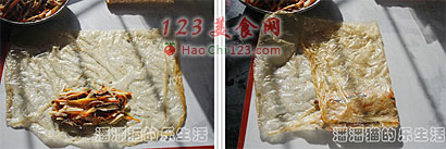 7、夹一些炒好的三丝放在油皮的下部三分之一处。