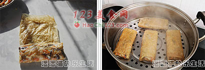 10、卷好的素鸭放入蒸锅中大火蒸7-8分钟。