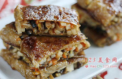 9、从下往上将包有三丝的豆皮卷起。
