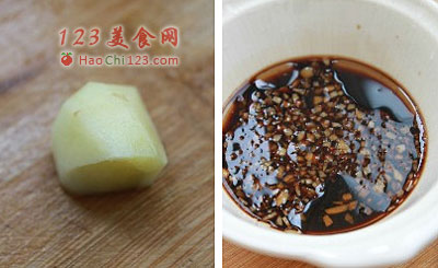 3、姜洗净去皮,切成末;取一小碗到入醋和香油,放入姜末,备用。