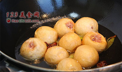5、锅中放入香叶,八角,水和塞好的面筋球,大火煮开。
